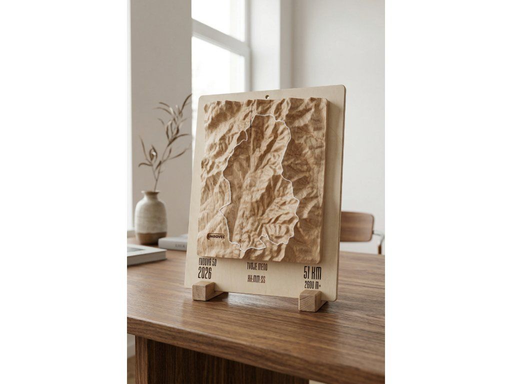 Reliéf trate je vyrezaný z bukového dreva a osadený na nosiči z brezovej preglejky, čo vytvára elegantný a prirodzený vzhľad. Každý kus je personalizovaný – doplnený o meno bežca a dosiahnutý čas, aby navždy pripomínal výnimočný športový výkon. Ideálny suvenír z pretekov alebo originálny darček pre vášnivého ultrabežca.